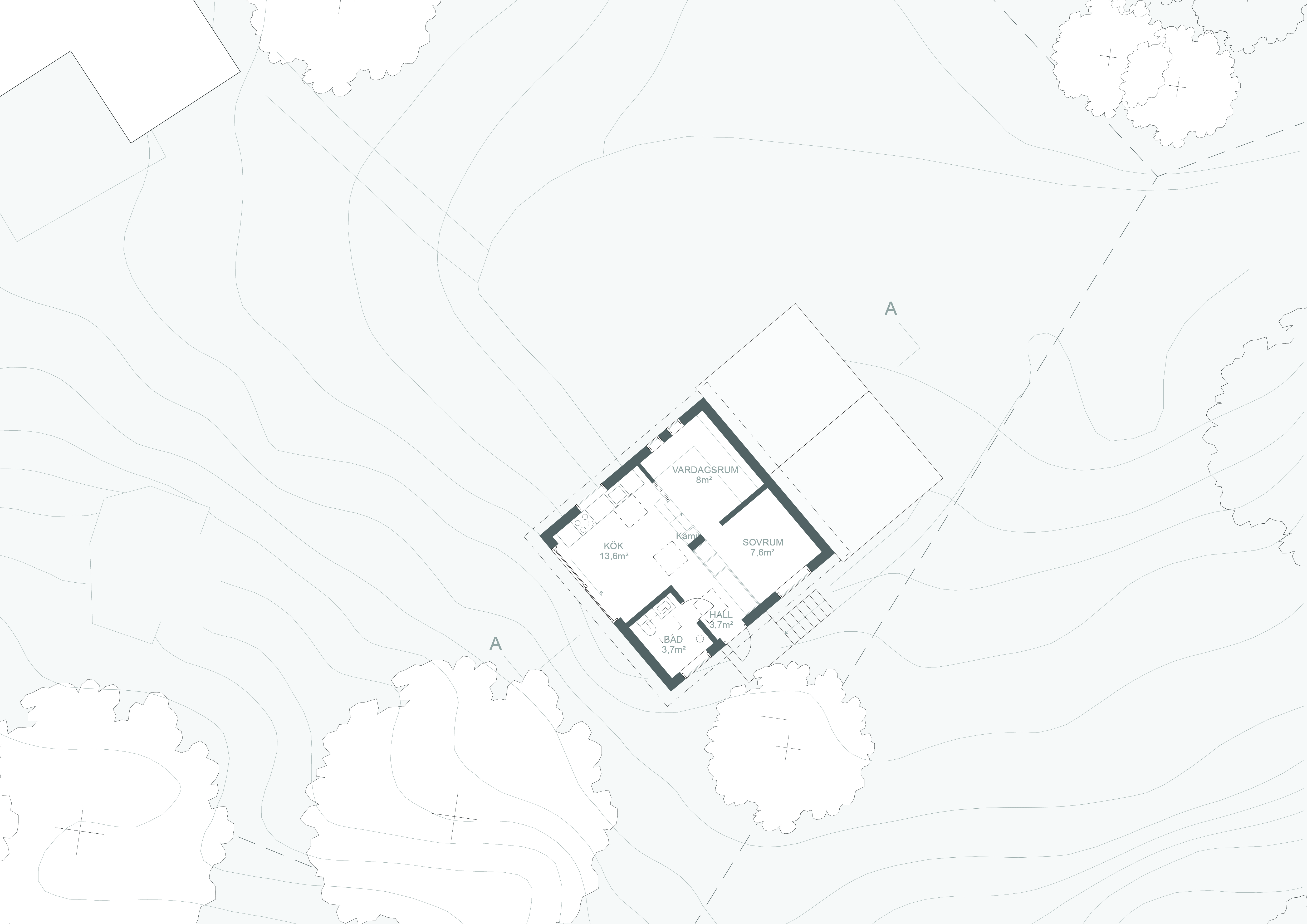 Fasad och volym speglar den befintliga bostaden på tomten, med vit stående träpanel, putsad sockel och sadeltak. Lägenhetens interiör ges en mer samtida gestaltning med inslag av obehandlade material i trä, tegel och infärgad microcement på golv, samt ett karaktäristiskt platsbyggt skiljeväggselement som orienterar sig mot och betjänar sovrum och entré. Den stora skjutdörren i köket skapar, när den öppnas, en direkt koppling mellan köksrummet och skogsgolvet, där man medvetet avstår från att anlägga en terrass.